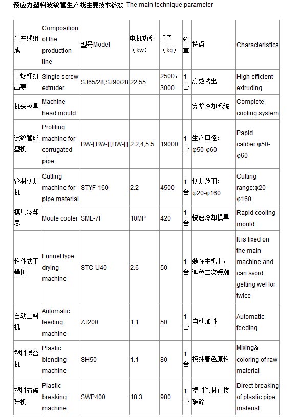 預(yù)應(yīng)力單波紋管作為一種新型成孔材料,與金屬波紋管相比,它具有不怕酸、堿腐蝕,密封性好,無滲水、漏漿,環(huán)剛度高,摩擦系數(shù)小,耐老化,抗電腐蝕,柔軟韌性好,不易被搗棒鑿破,施工連接方便等優(yōu)點,解決了傳統(tǒng)金屬波紋管的所有弊端。該管材最初是從國外引進的,價格高,供貨時間長。針對次現(xiàn)狀,青島中塑料機械制造有限公司在積極消化吸收進口設(shè)備的基礎(chǔ)上,依靠科研院校,研制開發(fā)并生產(chǎn)了以HDPE預(yù)應(yīng)力單壁波紋管為主的管材生產(chǎn)線。生產(chǎn)規(guī)格從φ50mm-φ160mm。該項目填補了國內(nèi)空白,無疑會對預(yù)應(yīng)力單壁波紋管管材的推廣及應(yīng)用超到良好的推動作用,也會給制品生產(chǎn)商帶來豐厚的利潤。